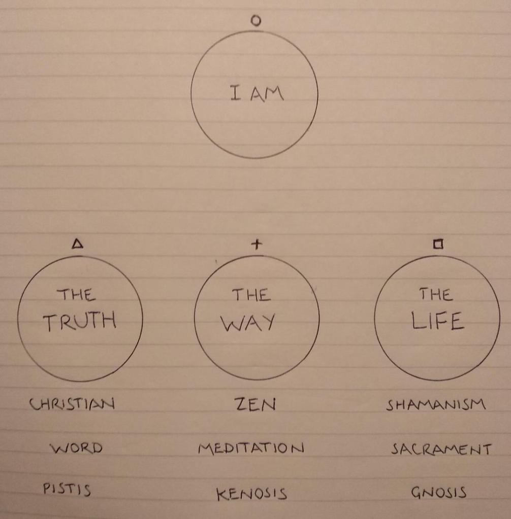 There are three principal types of meditation in Zen Christian Shamanism corresponding to “the Way”, “the Truth” and “the Life”. The first is silent, formless meditation. The second makes use of special forms of words in meditation, prayer and lectio divina. The third engages in altered states of consciousness.